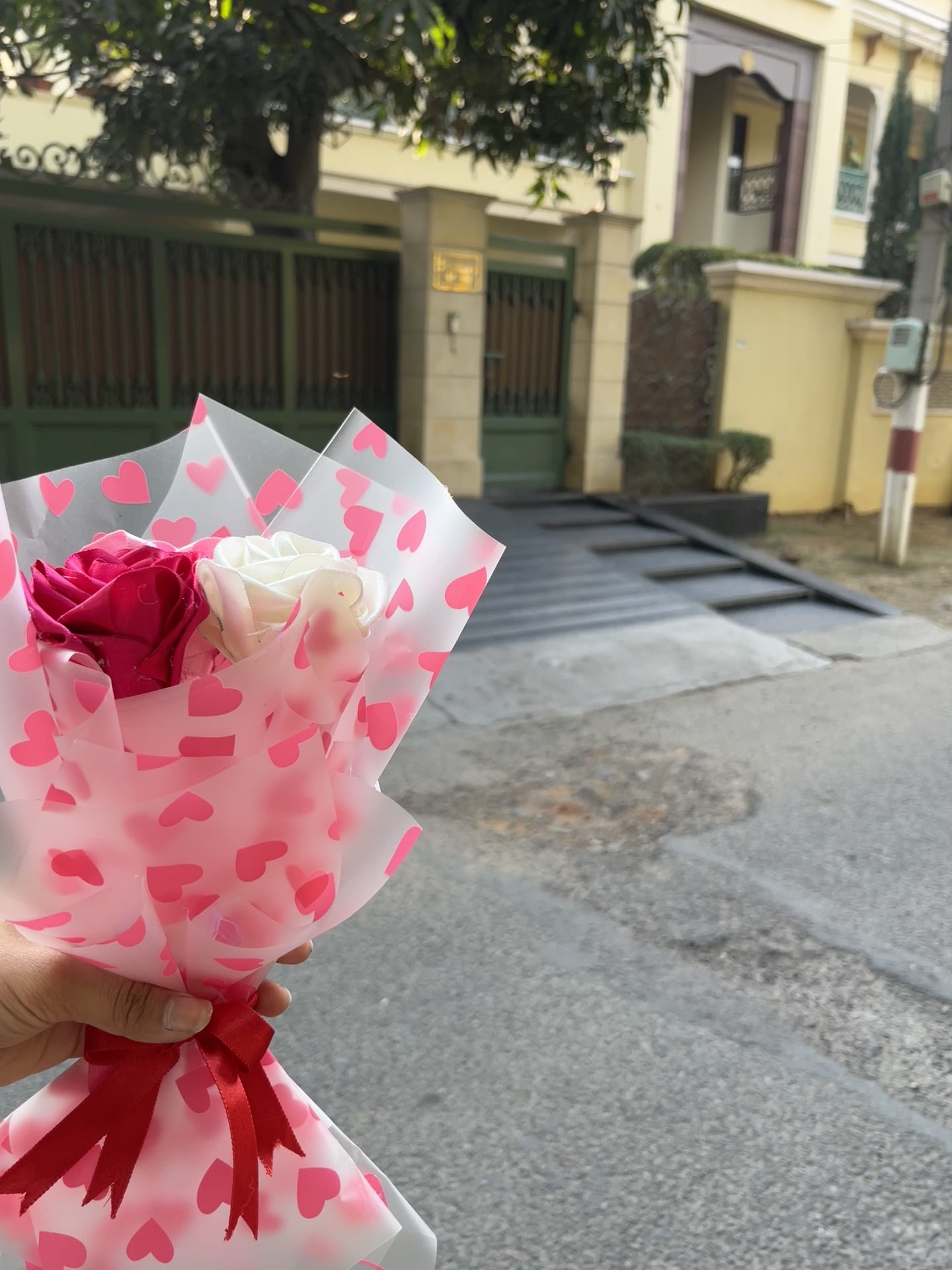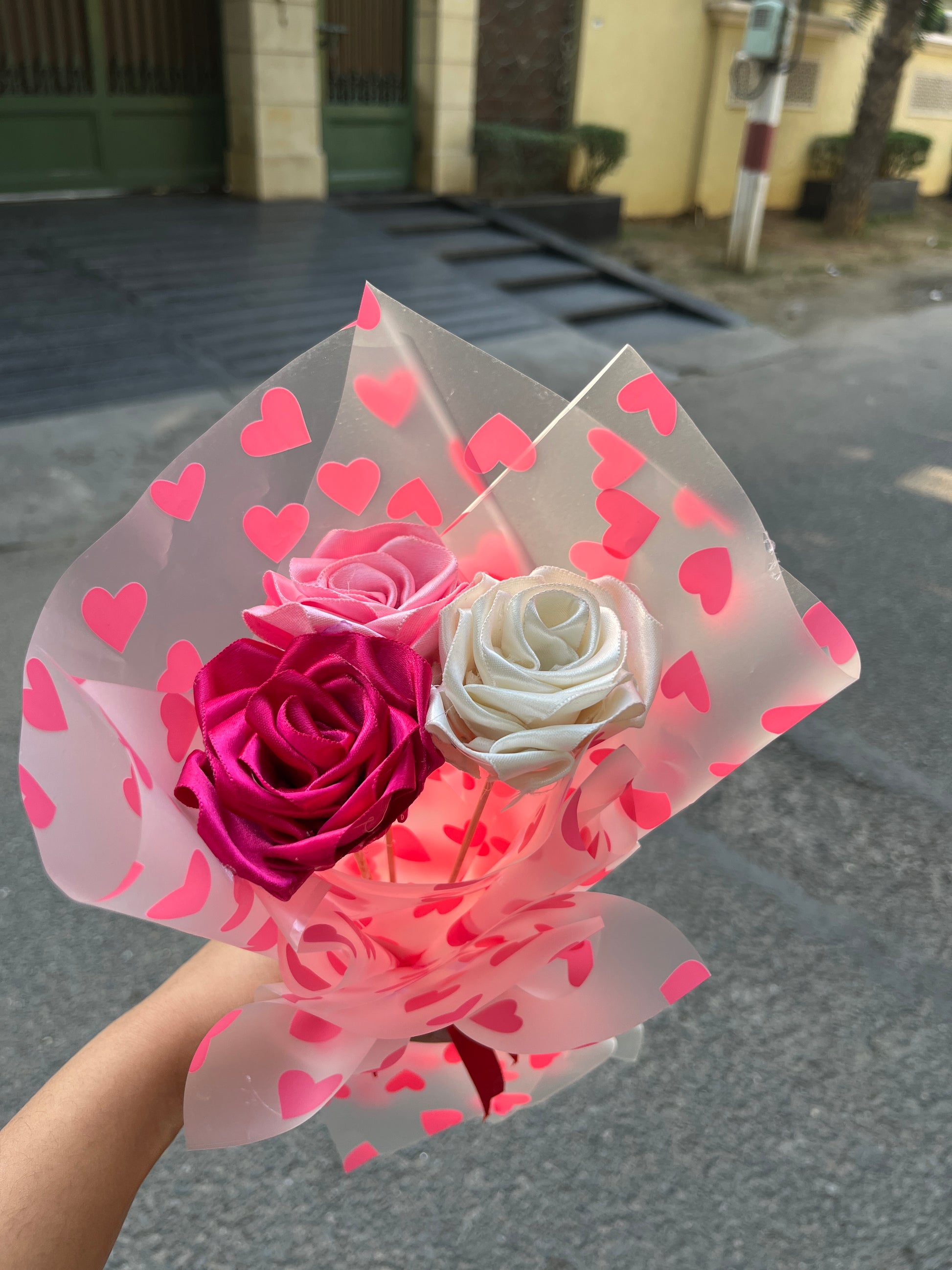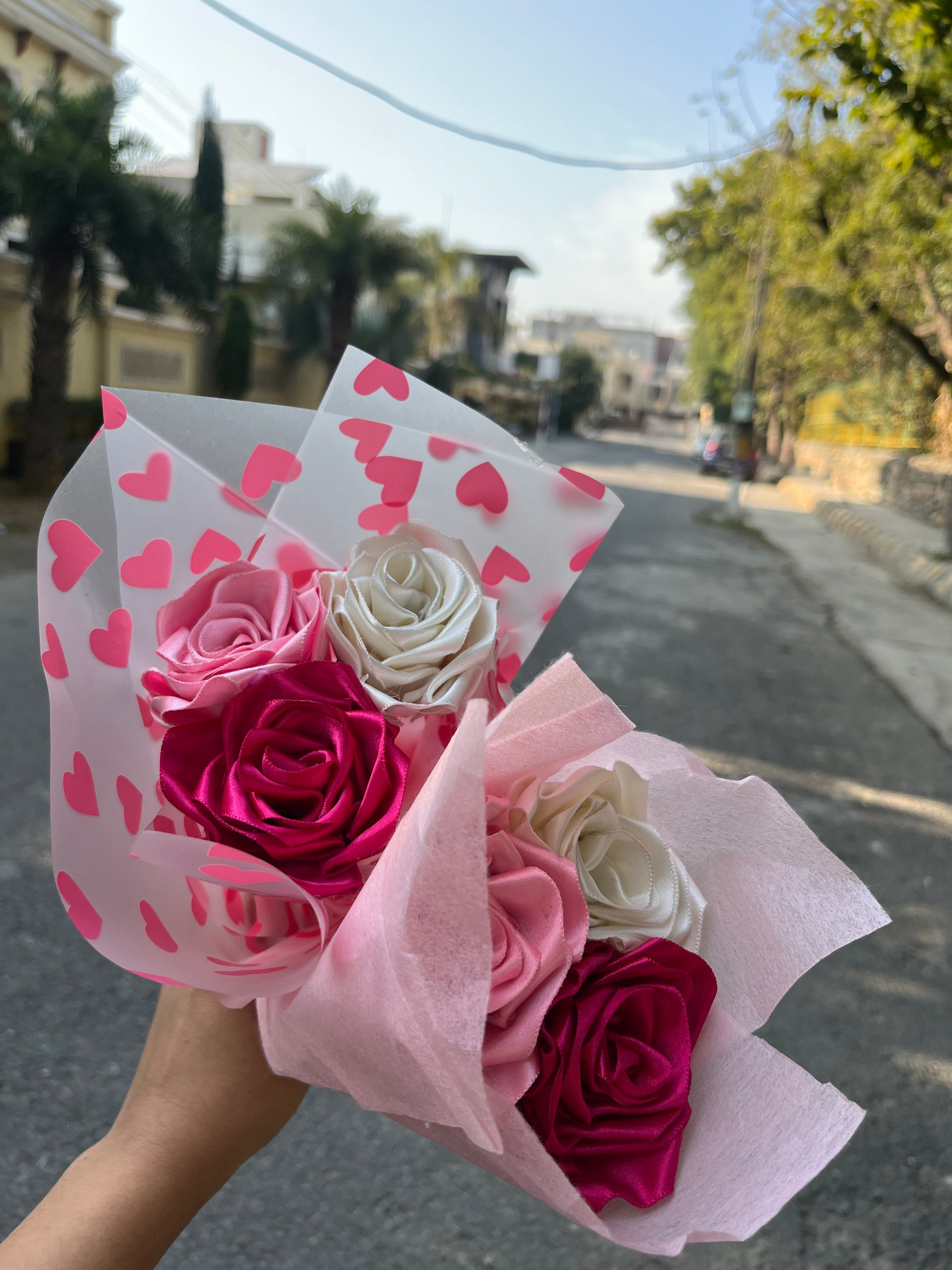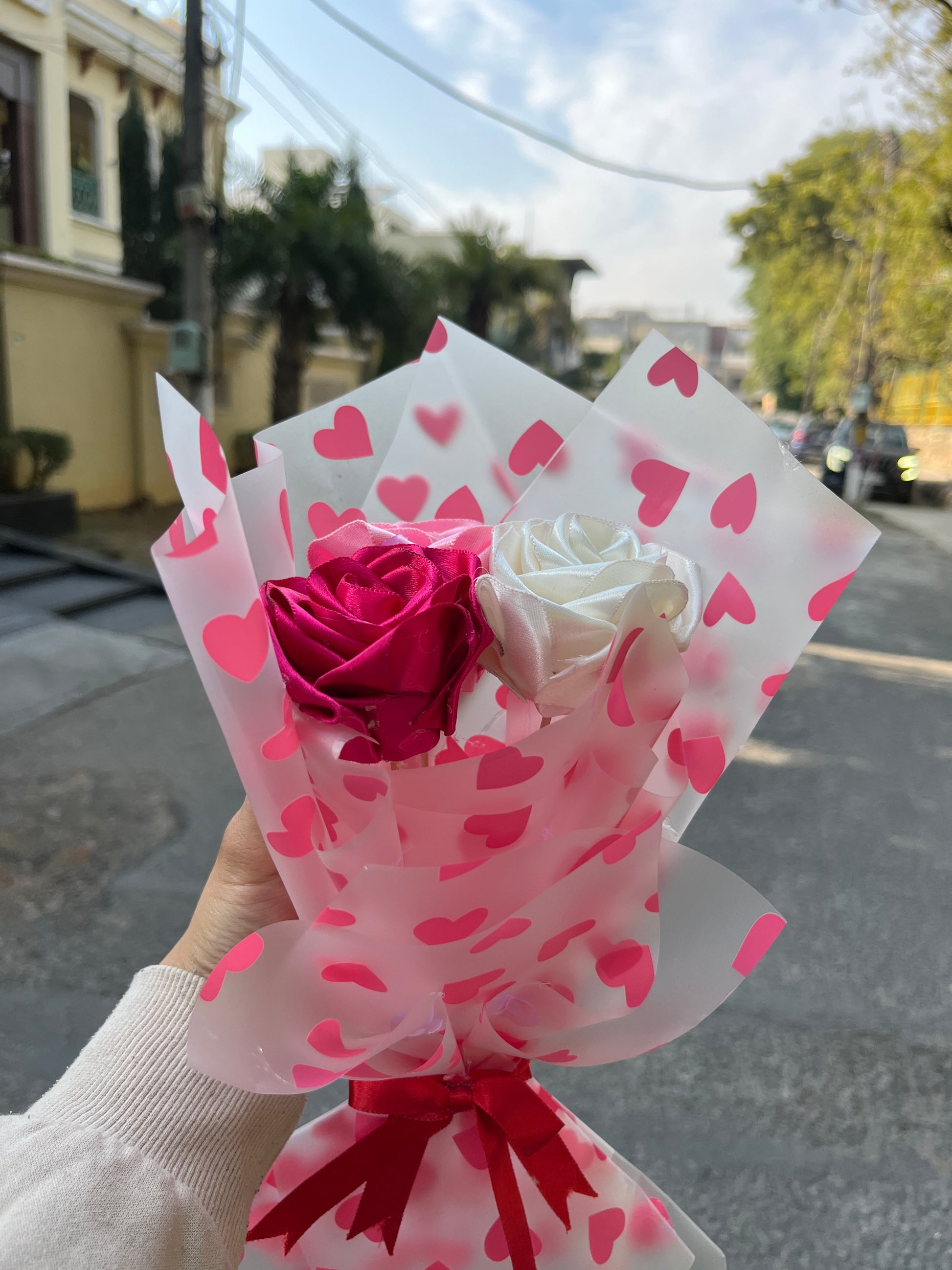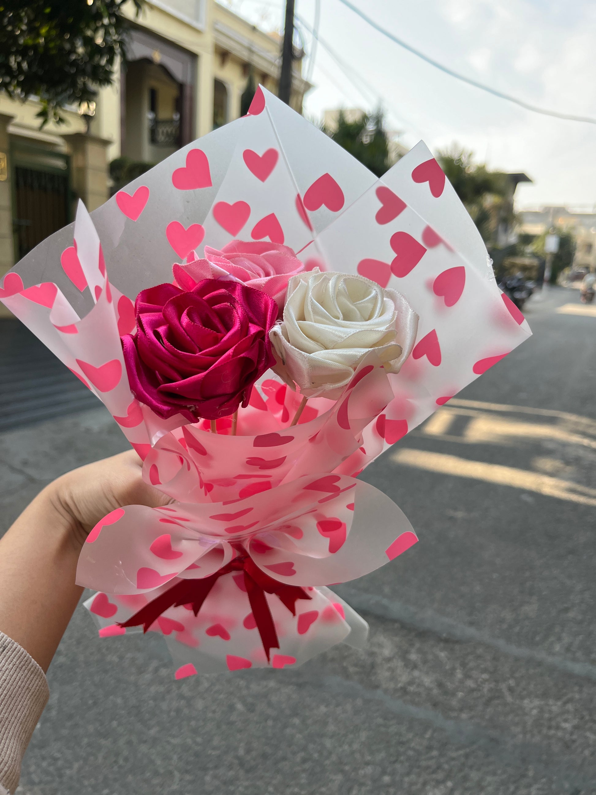 A satin rose bouquet in dark pink, light pink, and cream shades, wrapped in a charming heart-patterned sheet.