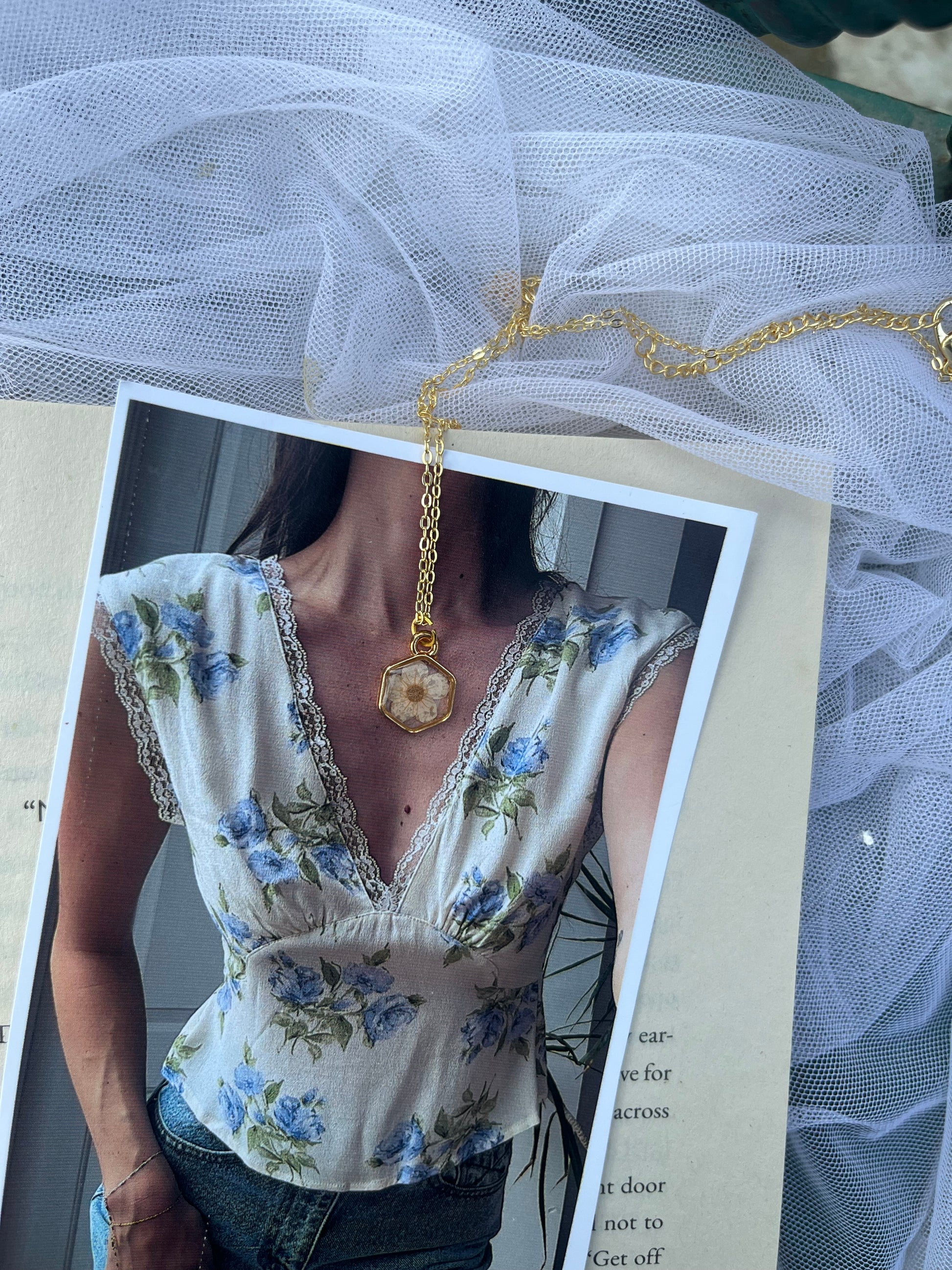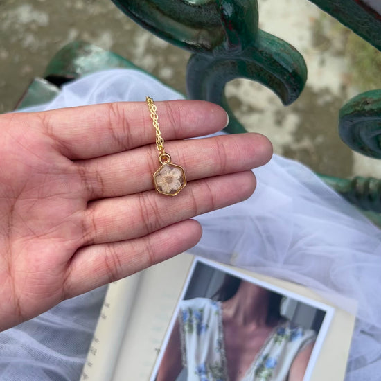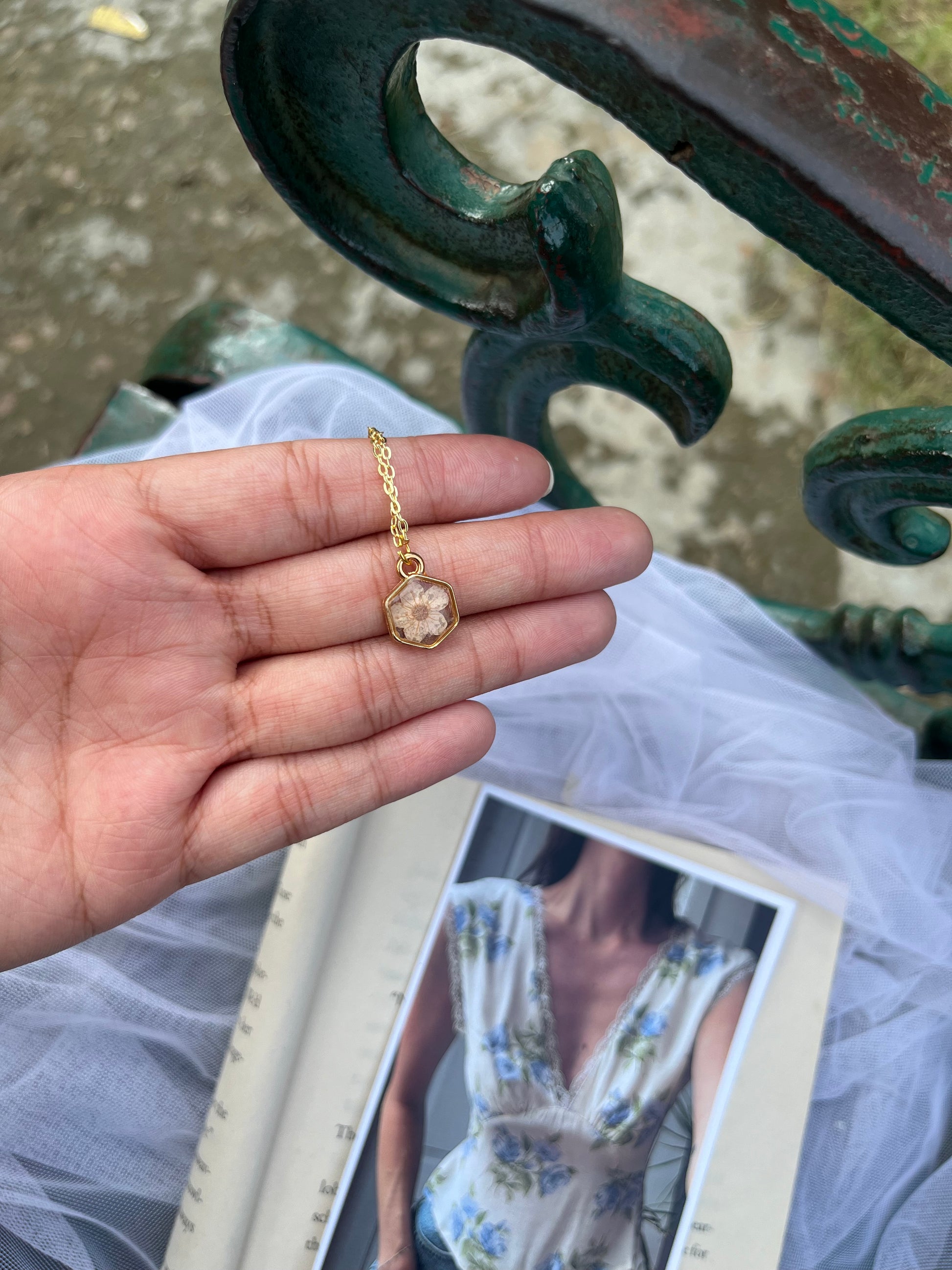 - **Design**: Features a tiny hexagonal pendant with a delicate flower inside.
