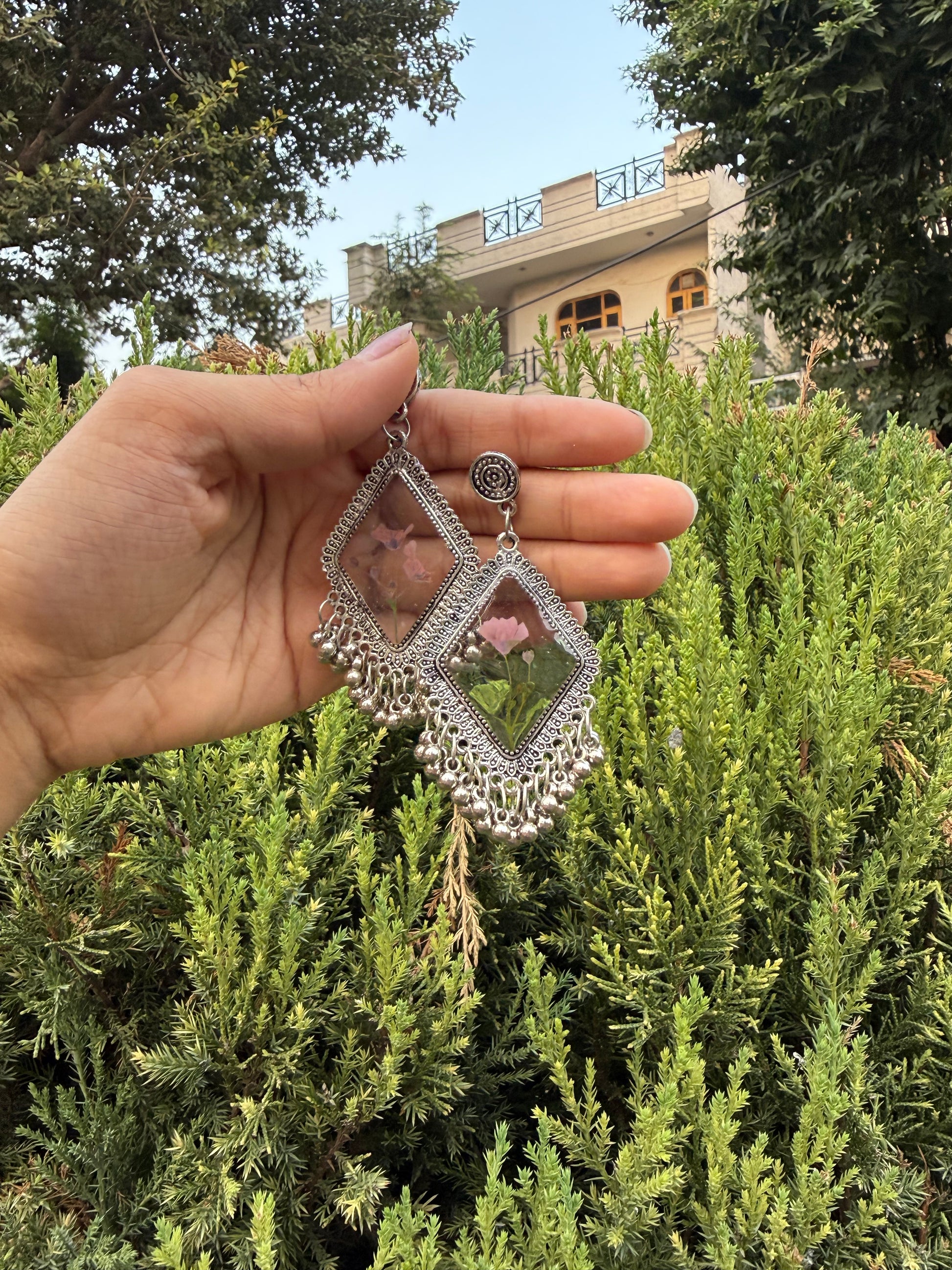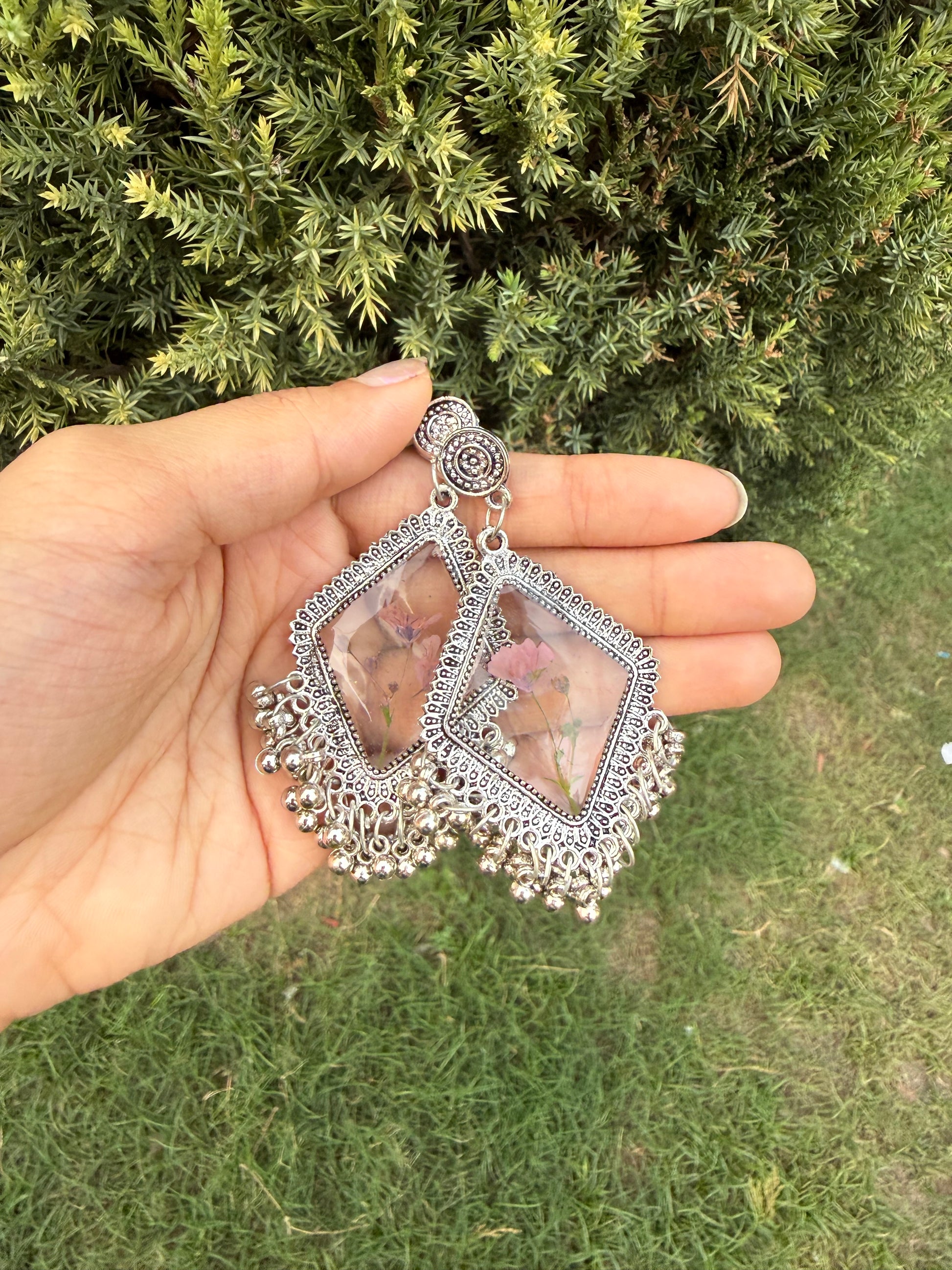 **Unique Design**: Each jhumka features real flowers, making them one-of-a-kind.