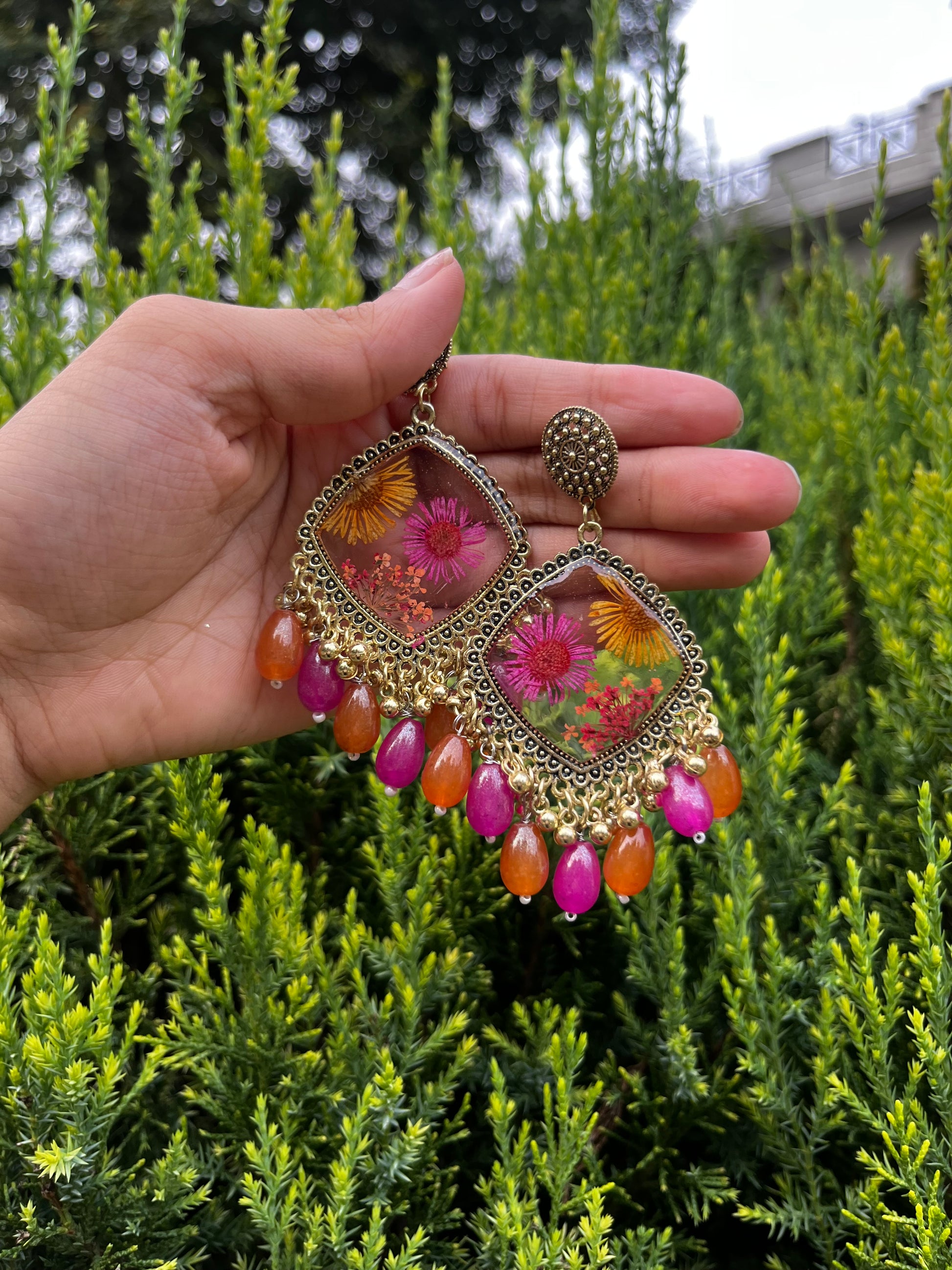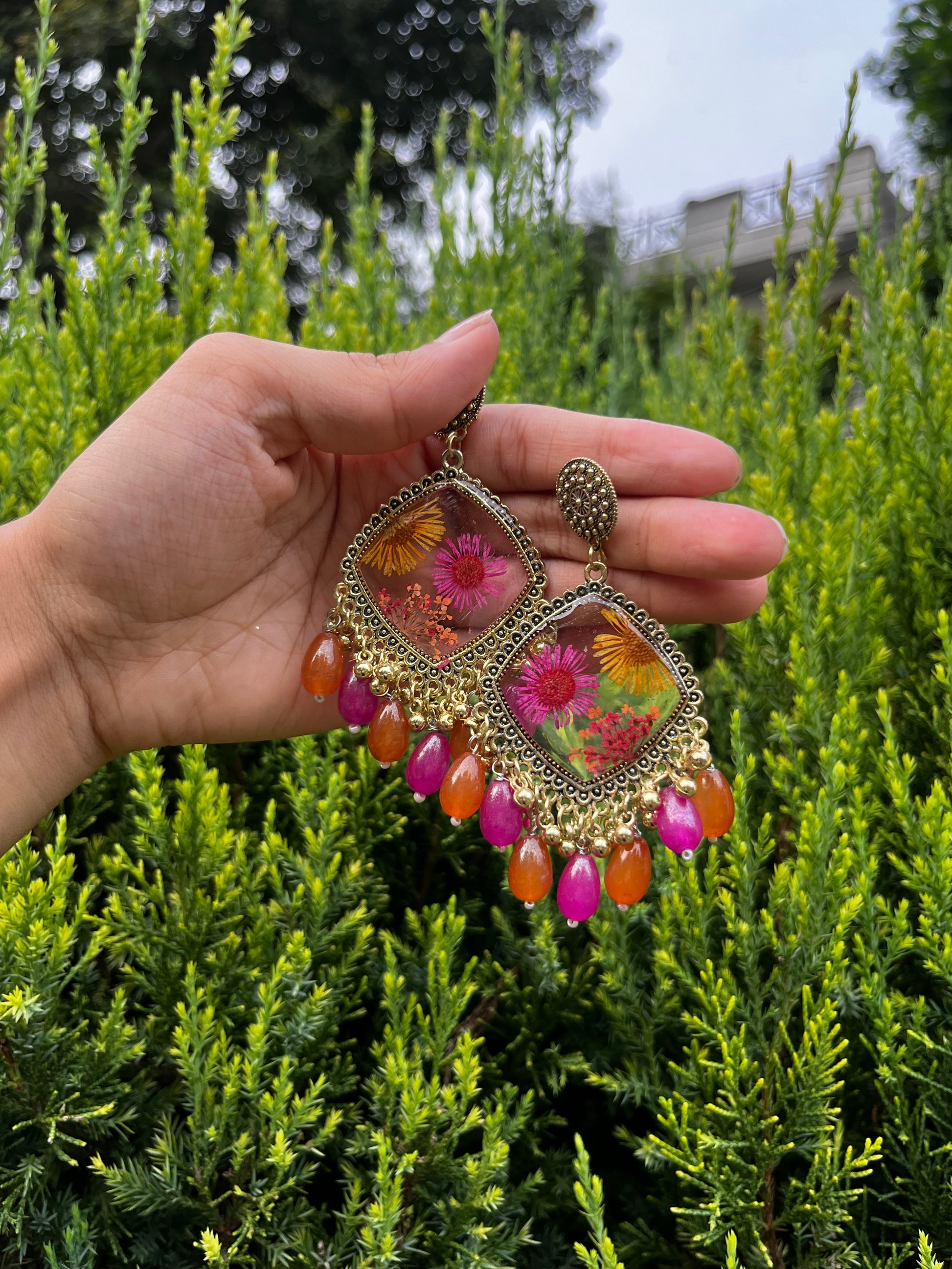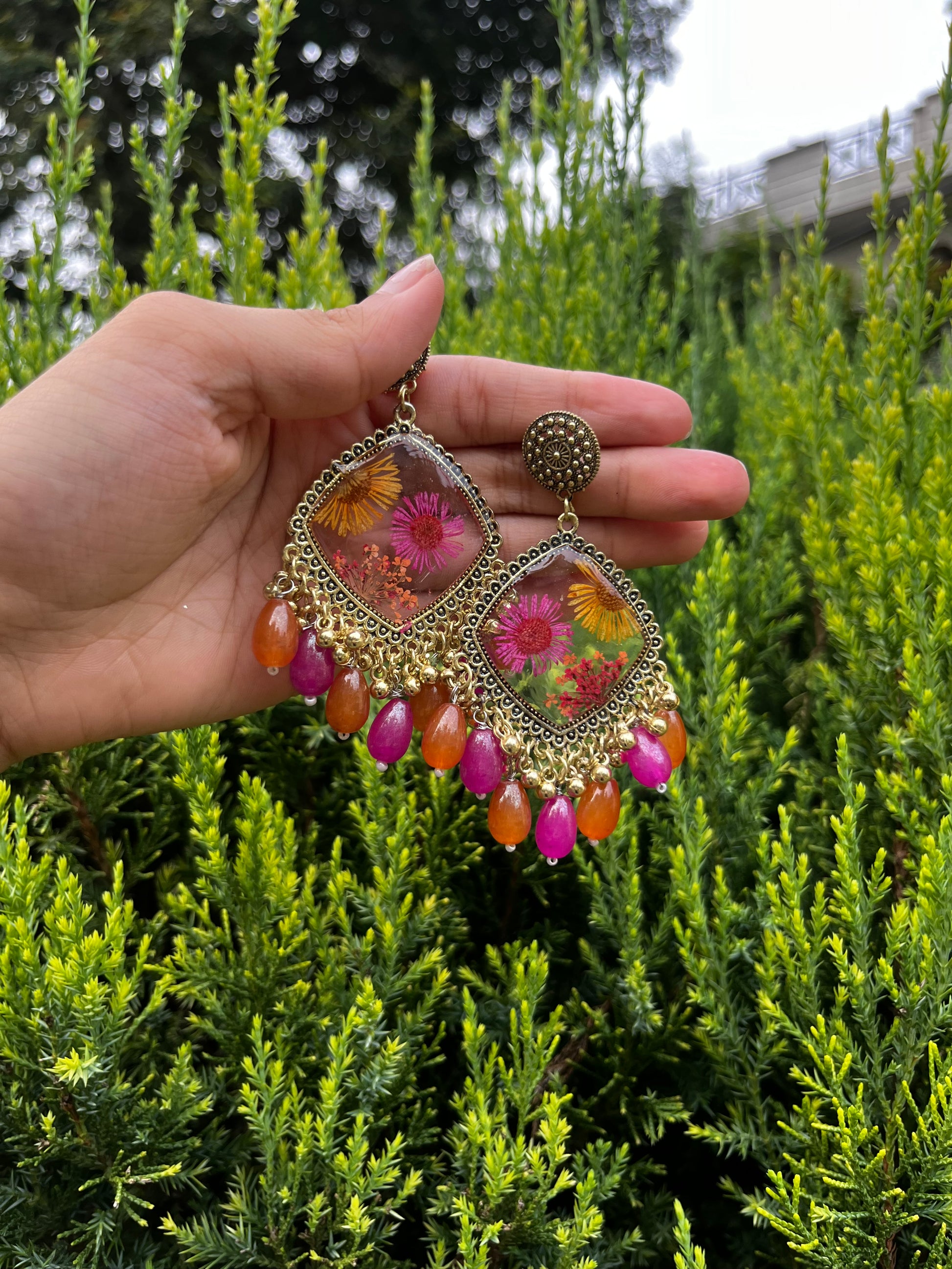 **Unique Design**: Each jhumka features real flowers, making them one-of-a-kind.